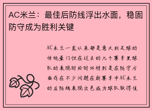 AC米兰:最佳后防线浮出水面,稳固防守成为胜利关键